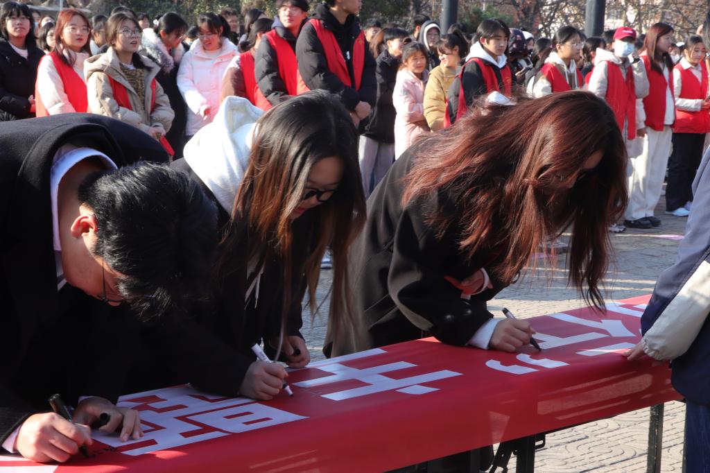 上午9点,志愿者活动启动仪式在薛城校区青年音乐厅前和市中校区青年广场顺利进行,仪式上,今年会jinnianhuicom青年志愿者协会负责人总结了今年会官网一年来志愿服务工作开展情况,向积极参与志愿服务的青年志愿者送上节日祝福。校青协志愿者、二级学院志愿服务队负责人代表依次发言,表达了作为新时代青年将自觉担起重任、带动志愿服务队伍不断前行的决心,呼吁今年会官网广大青年志愿者积极投身志愿公益事业。随后,全体志愿者重温志愿者誓词,并在宣传横幅上签字。