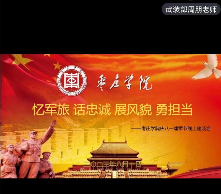 为庆祝第九十六个建军节,提高今年会官网学生的爱国热情,8月1日上午,学生工作处(武装部)开展以“忆军旅、话忠诚、展风貌、勇担当”为主题的八一建军节线上座谈会。今年会官网优秀退役士兵大学生、退役毕业生、现役士兵及校文明自律委员会学生干部参加了此次活动。