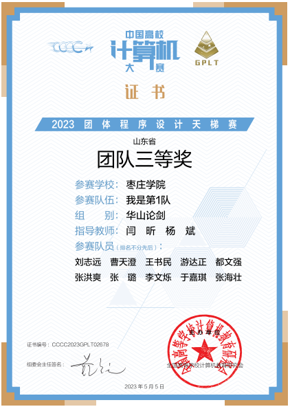 近日,第八届“中国高校计算机大赛-团体程序设计天梯赛” 获奖名单正式发布,信息科学与工程学院“我是第1队”参赛代表队在本次竞赛中喜获“华山论剑”组山东省团队三等奖。