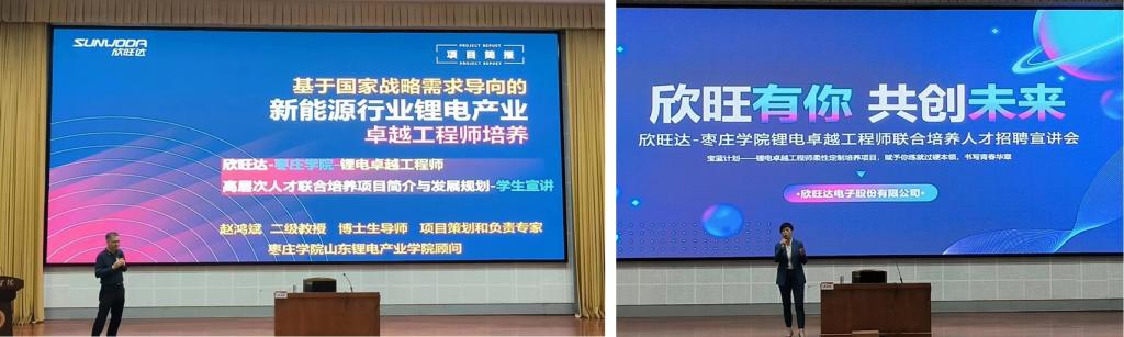 华翔总经理和周宗林总经理分别介绍了山东吉利欣旺达动力电池有限公司概况和山东欣旺达新能源有限公司概况,展示了欣旺达集团枣庄生产基地强大的市场竞争力和人才吸引力。赵鸿斌教授以“基于国家战略需求导向的新能源行业锂电产业卓越工程师培养”为题,对锂电卓越工程师人才培养项目情况作了详细的报告,介绍了锂电卓越工程师人才培养的重要意义、人才培养模式、成功案例以及未来的培养计划等。尹庆玲校长以“欣旺有你共创未来”为主题,结合个人发展经历,围绕欣旺达的发展历程和发展前景、卓越工程师人才培养等方面为大家带来一场精彩的报告。