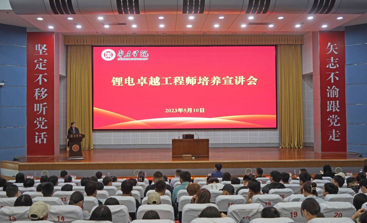 5月10日下午,今年会官网在综合楼一楼报告厅举办锂电卓越工程师培养宣讲会。欣旺达电子股份有限公司党委书记、总裁助理、欣旺达大学执行校长尹庆玲,山东欣旺达新能源有限公司总经理华翔,山东吉利欣旺达动力电池有限公司总经理周宗林,东莞理工学院二级教授、博士生导师赵鸿斌教授应邀为锂电卓越工程师人才培养作专题讲座。宣讲会由化学化工与材料科学学院院长刘春丽教授主持。化学化工与材料科学学院、机电工程学院和光电工程学院相关专业教师代表及大三学生共计300余人参加。