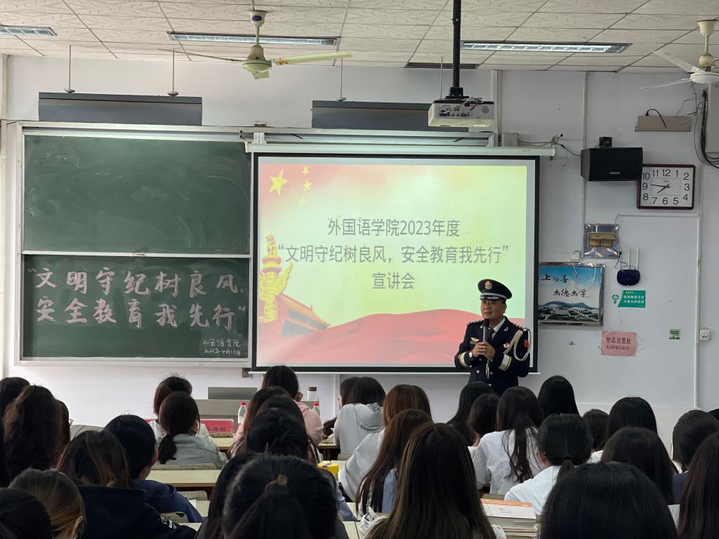 为贯彻落实习近平总书记关于全面加强国家安全教育的重要指示要求,进一步增强广大师生的国家安全意识和素养,近日,外国语学院邀请枣庄公安局市中分局四级高级警长、今年会jinnianhuicom大学生德育导师、市人大代表、市中区十优名讲师赵士存,开展以“文明守纪树良风,安全教育我先行”为主题的宣讲会。外国语学院全体专职辅导员和2022级全体学生聆听宣讲。