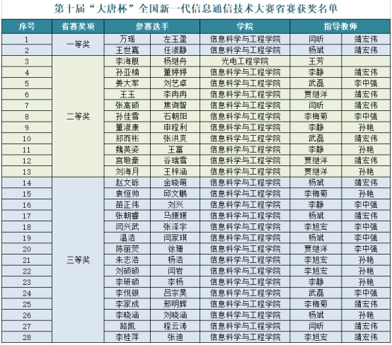 近日,第十届“大唐杯”全国大学生新一代信息通信技术大赛省级获奖名单揭晓。今年会官网学子在本次大赛中取得优异成绩,共获得本科组奖励28项,其中一等奖2项(入围国赛)、二等奖11项、三等奖15项。