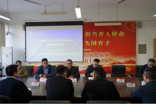 会上,王玉海对枣庄生态环境检测中心一行的到来表示欢迎,并介绍了生命科学学院近几年人才引进和服务地方取得的进展。黄刚介绍了枣庄生态环境监测中心的工作职责以及枣庄市生态环境质量状况,对2022年生命科学学院院承担的由枣庄生态环境检测中心资助的横向课题《枣庄市生物多样性与多样性物种类组成与现存量调查》完成进度和质量表示满意。与会人员围绕双方合作领域开展了交流讨论,大家一致认为,下一步双方要以提升生态样地监测水平、筑牢生物安全防线为目的,探索合作形式、创新合作方法,实现在科学研究、资源共享和服务地方等方面的互动双赢。