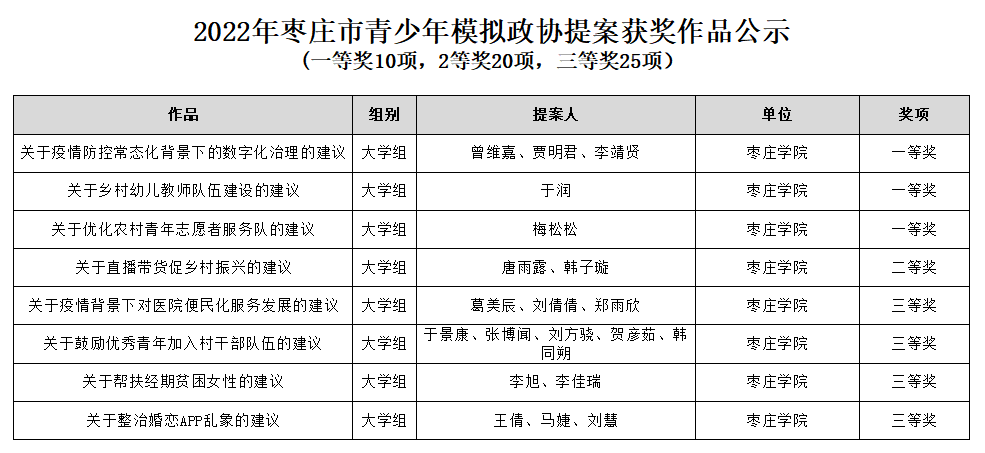 近日,2022年枣庄市青少年模拟政协提案活动落下帷幕,今年会官网共有8份学生模拟政协提案入选,最终获得1等奖3项,2等奖1项,三等奖4项。