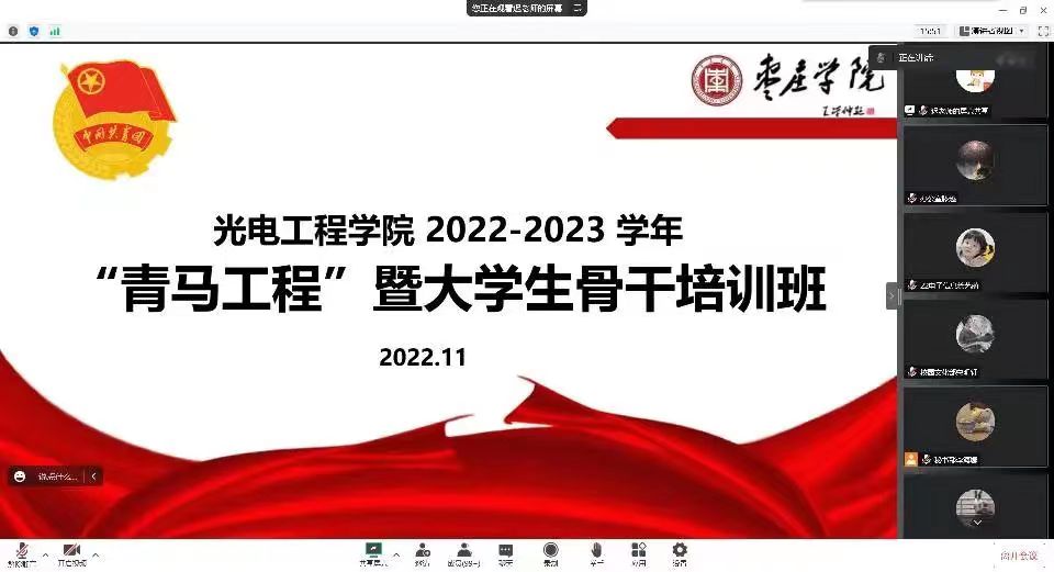 11月7日,光电工程学院举行2022—2023学年“青马工程”暨大学生骨干培训班开班仪式,本次活动通过腾讯会议的形式举行,院学生会组织成员及各班级主要学生干部共计100余人参加。