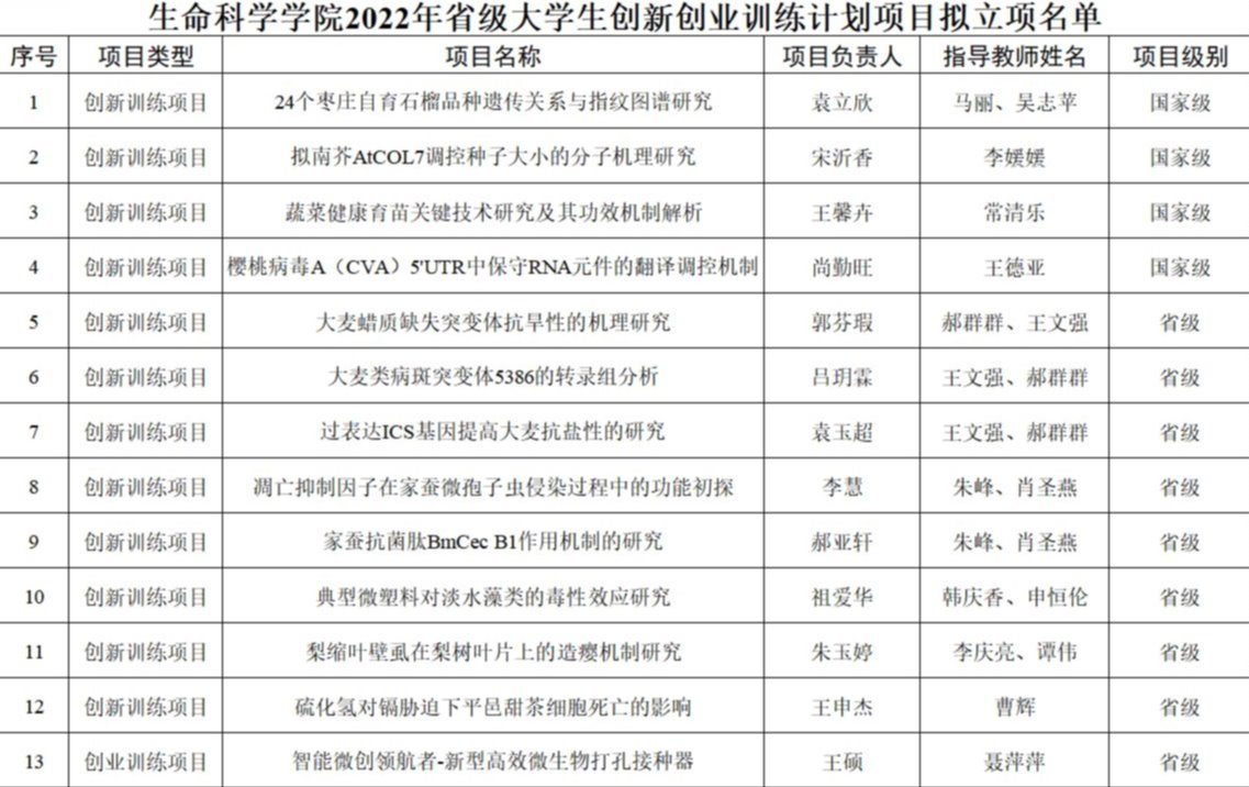2022年是学校重点工作攻坚年,也是硕士点建设关键年。生命科学学院积极落实学校创新发展理念,始终把大学生创新创业训练计划立项工作作为提升大学生专业能力的重要途径。学院设立的大学生创新活动中心以创新创业实践活动为支撑,以各种创新创业竞赛为抓手,有效提升了学院人才培养质量和水平。