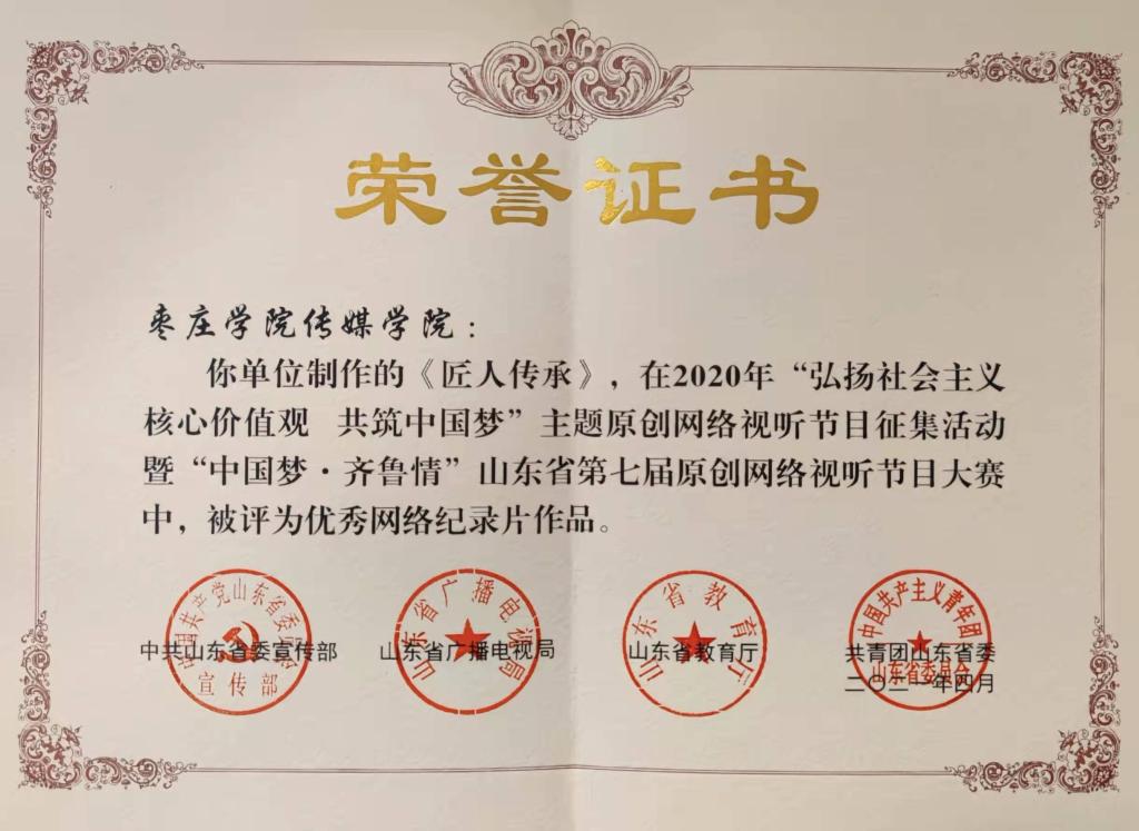 近日,由山东省委宣传部、山东省广播电视局、山东省教育厅、共青团山东省委共同组织发起的2020年“弘扬社会主义核心价值观,共筑中国梦”主题原创网络视听节目大赛落下帷幕。今年会官网传媒学院教师王金军制作的系列纪录片《匠人传承》被评为山东省第七届原创网络视听节目大赛优秀网络纪录片。