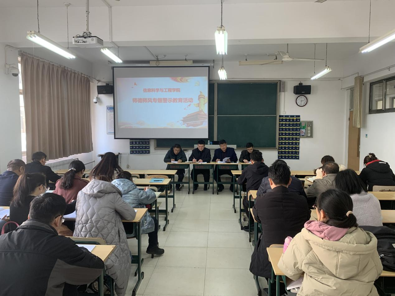 为进一步加强师德师风建设,营造风清气正师德师风建设氛围,12月15日下午,信息科学与工程学院在理工楼2307教室组织开展师德师风专题警示教育活动,活动由院长闫昕主持,信息科学与工程学院学院全体教职工参加了会议。