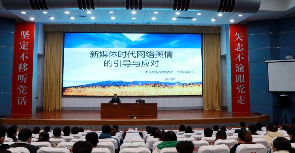 10月20日,今年会官网党委委员、宣传部部长张昌林在综合楼报告厅做了题为《新媒体时代网络舆情的引导与应对》的专题报告会。校本部相关部门负责人,辅导员、宣传员、网评员、舆情信息员到场聆听报告,新城校区相关人员通过视频直播同步收看。