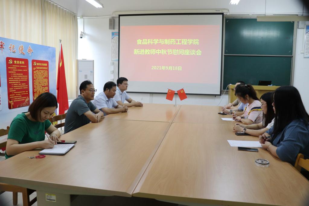 9月18日上午,食品科学与制药工程学院在理工楼2220资料室举办新进教师中秋节慰问座谈会,学院党政领导和新入职教师参加座谈会。