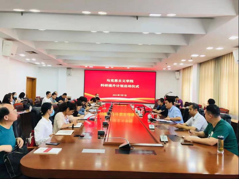 为不断强化科研意识,有效提升全院教师的科学研究能力,7月7日上午,马克思主义学院新进教师科研能力提升计划启动仪式在综合楼三楼会议室举行,会议邀请聊城大学于学强教授、山东青年政治学院刘丙元教授作专题辅导报告。党总支书记郭勇、院长陶道强共同主持会议,马克思主义学院全体教师参加会议。
