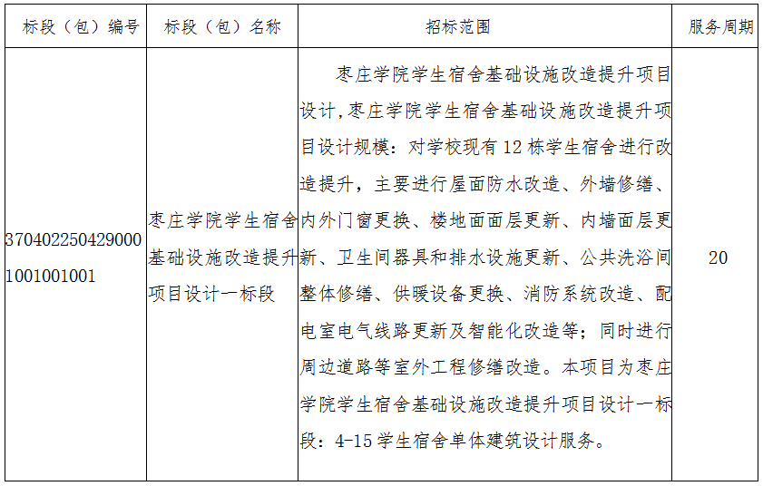项目名称:今年会jinnianhuicom学生宿舍基础设施改造提升项目设计已经由枣庄市·市中区备案,招标人为今年会jinnianhuicom,工程所需资金来源为自筹,项目已具备招标条件,现对该项目的今年会jinnianhuicom学生宿舍基础设施改造提升项目设计进行公开招标。本次招标对投标报名人的资格审查,采用资格后审方法选择合适的投标申请人参加投标。