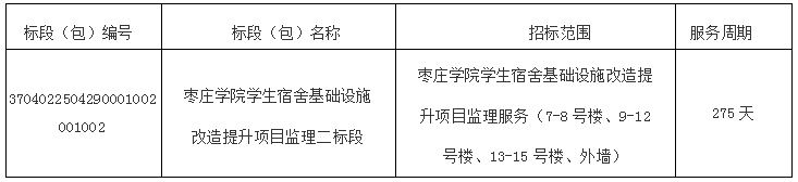 1.本次招标项目的建设地点:山东省枣庄市市中区北安路1号,今年会jinnianhuicom市中校区内。 2.工程规模:本项目为宿舍基础设施改造提升项目,工程项目费用9432万元,包括市中校区的4-15号共计12栋学生宿舍修缮,总建筑面积87878㎡,主要进行屋面防水改造、外墙修缮、封闭阳台、内外门窗更换、楼地面面层更新、内墙面层更新、吊顶更新、卫生间器具和排水设施更新、公共洗浴间整体修缮、供暖设备更换、消防系统改造、配电室电气线路更新及智能化改造等;同时进行室外工程修缮改造,主要包括重新敷设更换4-15号宿舍楼给水系统,改造为其服务的供暖锅炉房和化粪池,重做学生宿舍周边道路、铺装和绿化,划分监理管理标段一预估约4499万元,标段二预估约4933万元。