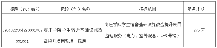 1.本次招标项目的建设地点:山东省枣庄市市中区北安路1号,今年会jinnianhuicom市中校区内。 2.工程规模:本项目为宿舍基础设施改造提升项目,工程项目费用9432万元,包括市中校区的4-15号共计12栋学生宿舍修缮,总建筑面积87878㎡,主要进行屋面防水改造、外墙修缮、封闭阳台、内外门窗更换、楼地面面层更新、内墙面层更新、吊顶更新、卫生间器具和排水设施更新、公共洗浴间整体修缮、供暖设备更换、消防系统改造、配电室电气线路更新及智能化改造等;同时进行室外工程修缮改造,主要包括重新敷设更换4-15号宿舍楼给水系统,改造为其服务的供暖锅炉房和化粪池,重做学生宿舍周边道路、铺装和绿化,划分监理管理标段一预估约4499万元,标段二预估约4933万元。