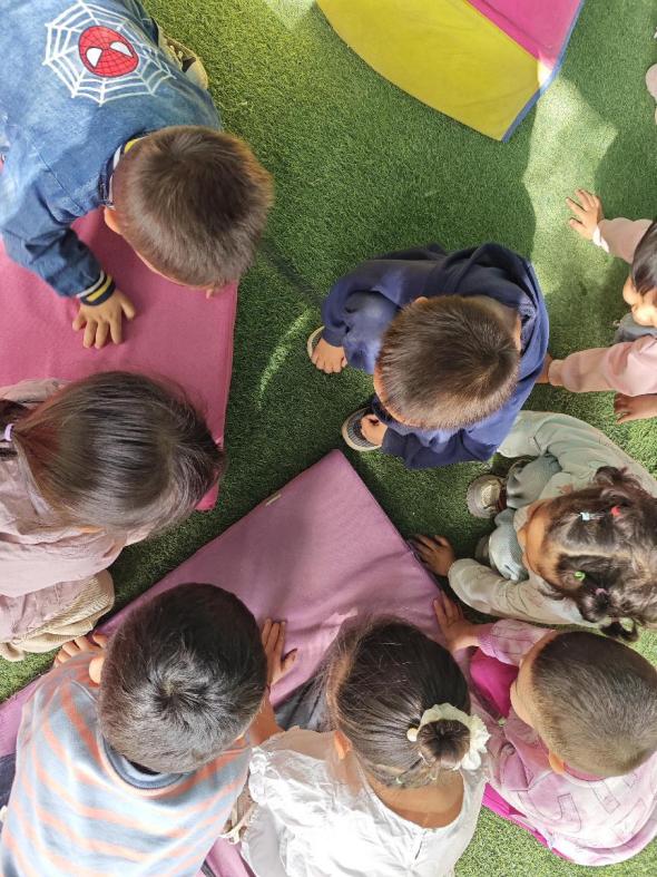 今天阳光暖暖的,我带着小朋友们去操场的草地上做游戏。突然,祖丽阿依蹦蹦跳跳地跑过来,小脸通红地喊:“老师!那里地上有‘毛毛虫’!”孩子们“呼啦”一下全围了过去,你推我挤地探着小脑袋,七嘴八舌地讨论起来:“它好小呀!”“它会不会咬人呀?”胆子大的阿依妃尔伸出食指想戳一戳,又猛地缩回手:“老师,它的头在晃!是不是要咬我?”