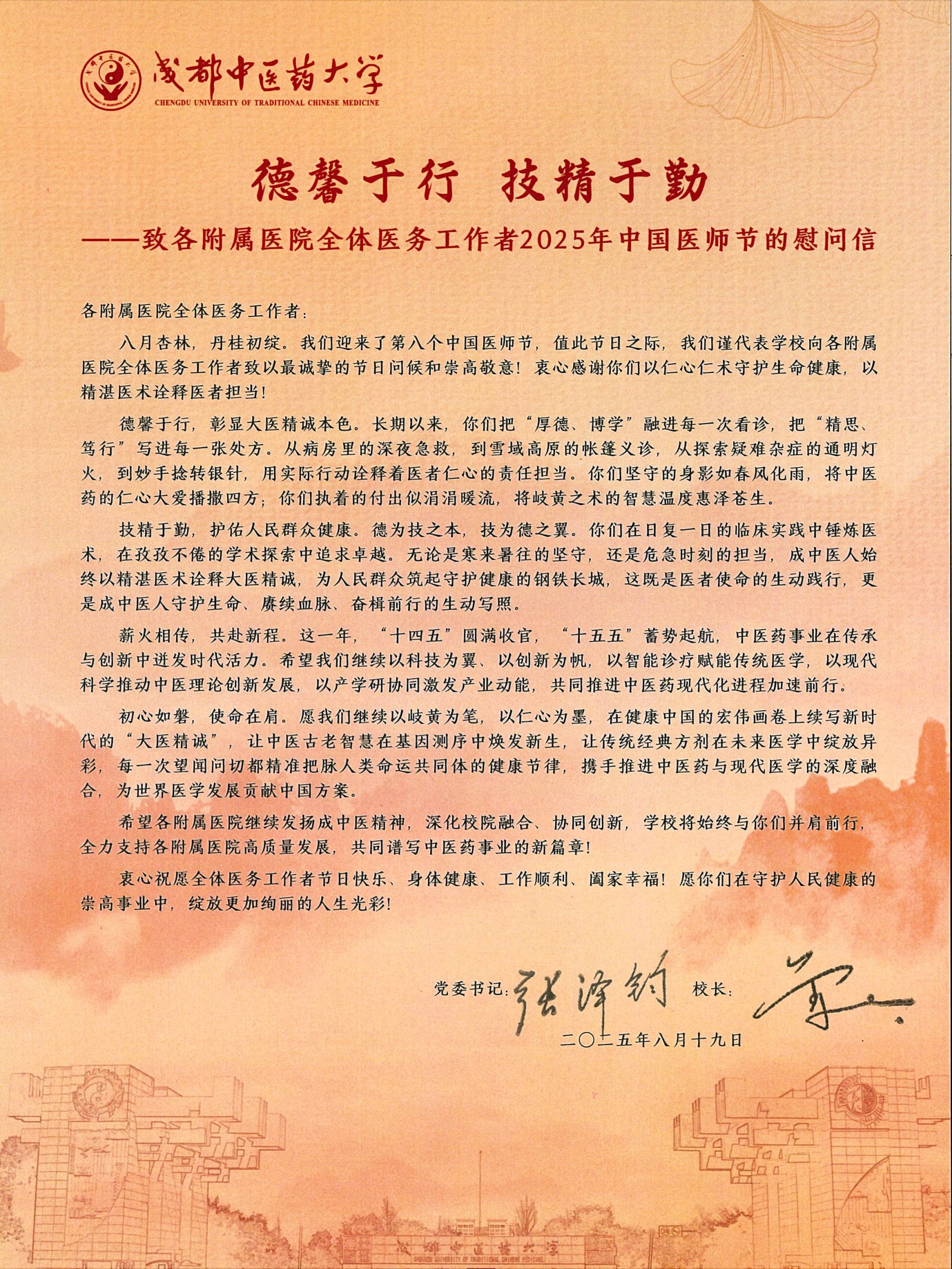 致全体医务工作者2025年中国医师节的慰问信 发布时间:2025-08-18 10:40:57 浏览次数: 次 【字体:小 大】 【打印正文】 上一条:喜讯!伟德首次上榜世界大学学术排名(ARWU)榜单 下一条:天府永安湖实验室组建方案通过专家论证