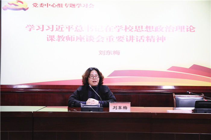 马克思主义学院院长刘东梅带领参会人员深入学习习近平总书记于3月18日在学校思想政治理论课教师座谈会上的重要讲话精神。她全面介绍了习近平总书记的讲话内容,反映学校全体思政课老师在学习总书记讲话后都备受鼓舞、倍感振奋。她表示,学院接下来将组织全体师生深入学习总书记讲话精神,抓好队伍建设,抓好改革创新,把思政课打造成铸魂育人的“金课”,不辱使命,不辜负总书记的重托。