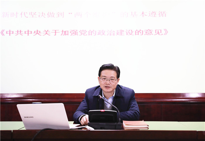 刘毅以“新时代坚决做到‘两个维护’的基本遵循”为题,领学《中共中央关于加强党的政治建设的意见》的重大意义和主要内容。他从“一条主线”“四个要素”“四个环节”等三方面分析了《意见》的主要内容,指出《意见》具有“政治性”“系统性”“统领性”和“针对性”四个特点,指出《意见》是贯彻习近平新时代中国特色社会主义思想和党的十九大精神的重大举措,是党中央深刻总结历史经验和新鲜经验对新时代加强党的政治建设作出的重大决策部署。刘毅强调,学校各级领导干部要进一步深化对党的政治建设的认识,增强推进党的政治建设的自觉性坚定性,提高政治能力,防范政治风险,为学校事业发展提供坚强政治保证。