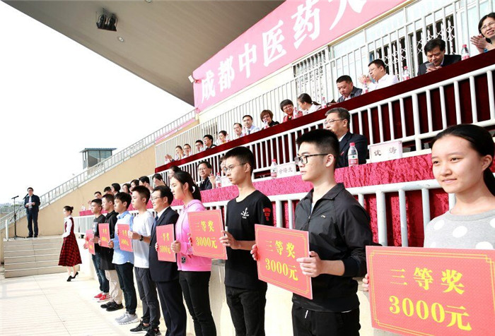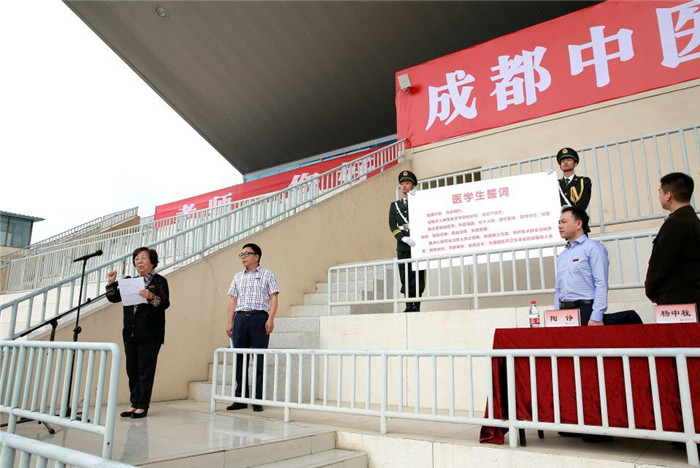 在激昂的校歌歌声中,校领导和以首届国家级教学名师、中药学专家万德光教授为首的十多名教师代表一起为25名新生代表佩戴上校徽,寄寓着学校对同学们传承岐黄薪火、发扬成中医精神的期望。