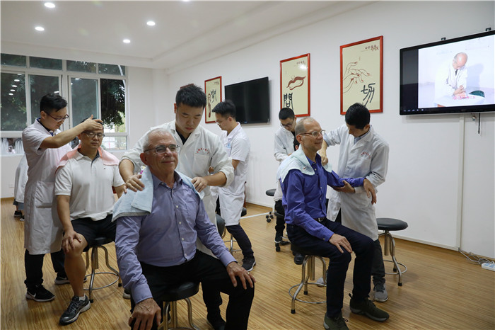 会议结束后,简诺夫等来宾漫步校园,参观了博物馆,与中医药文化亲密接触,并亲身体验中医推拿的奇妙。