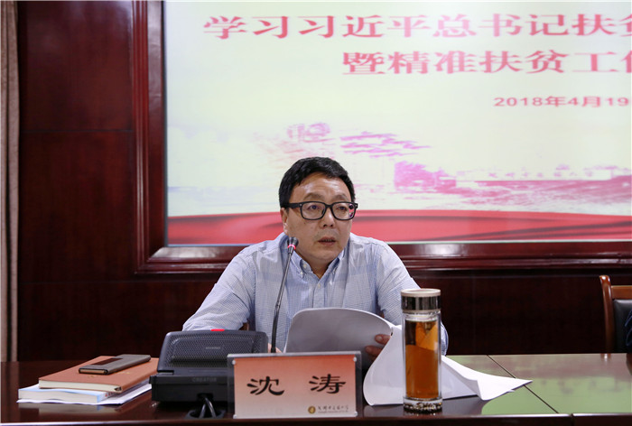 4月19日下午,学校党委中心组在行政楼五会议室召开学习习近平总书记扶贫开发战略思想暨精准扶贫工作动员会,专题学习习近平总书记扶贫开发战略思想,并在总结学校前期参与精准扶贫工作的基础上,进一步部署推进定点联系帮扶脱贫攻坚工作。党委中心组全体成员、科以上领导干部参加会议。党委副书记沈涛主持会议。