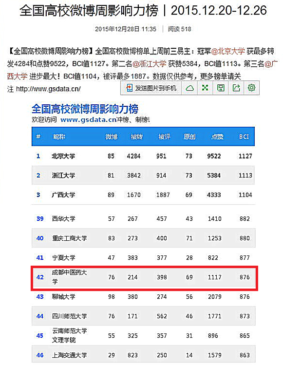 学校官方微博在全国高校微博周影响力榜中位居42名(2015.12.20-12.26) 发布时间:2015-12-28 15:19:00 浏览次数: 次 【字体:小 大】 学校开通官方微博以来,共设置各类话题109个,发布微博3712条,开展线上线下活动9次,粉丝达到10315。在各类影响力排行榜中,有20次进入全国高校微博周影响力排行榜百强,8次进入全国高校微博周影响力排行榜前50名,1次进入全国高校微博周影响力排行榜前20名,14次进入全国医学院院校微博周影响力排行榜前3名且有5次位居首位。 (编辑/任翔) 【打印正文】 上一条:学校官方微博在全国高校微博周影响力榜中位居42名(2015.12.20-12.26) 下一条:离退休党委学习贯彻十八届五中全会精神并召开2015年离退休工作总结会