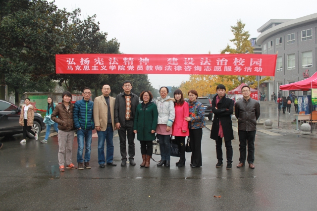今年12月4日是我国第二个国家宪法日,又是全国第十四个全国法制宣传教育日。为大力弘扬宪法精神,切实维护宪法权威,不断增强广大师生法治观念,深入推进依法治国、依法治校进程,更好地为全校师生提供面对面的法律服务,12月3日中午,马克思主义学院党总支在学校通惠广场开展了以“弘扬宪法精神,建设法治校园”为主题的法治宣传及法律咨询活动。学院党政领导、总支委员及具有法学专业背景的党员教师杨年富、石晓华、周海洋、谢时国、凌霄等参加此次活动。