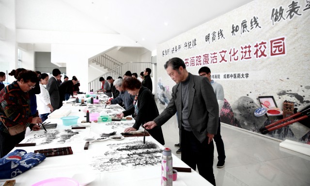 11月16日,为大力营造学习宣传贯彻《准则》《条例》的浓烈氛围,加强反倡廉文化建设,提升人文素养,优化校园环境,学校邀请四川西岭书画院书画艺术家走进校园,举行“学准则记条例守纪律,明高线知底线做表率”——廉洁文化进校园活动。在四川西岭书画院院长、原四川省人民政府副省长徐世群的关心和支持下,委托由原四川省人大副主任、四川省老年书画研究会常务副会长李洪仁和西岭书画院常务副院长孙灵根带队,周家兰、卢成春、吴家富、蒲生龙等12位书画艺术家们现场创作以廉洁文化为主题的艺术作品,并将33件精美的艺术作品捐赠给学校作为永久展出。