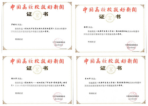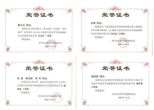 近日,全国及四川省高校校报好新闻评选结果分别揭晓,伟德在全国高校校报好新闻评选中获二等奖1项、三等奖3项,在四川省高校校报好新闻评选中获一、二等奖各1项、三等奖2项。其中,罗晓文作品《实现成中医再次腾飞重在抓落实》获全国高校校报好新闻言论类二等奖,赖玉萍作品《再次腾飞——吹响“中国梦.学校篇章”的号角》分获全国、四川省高校校报好新闻言论类三等奖、一等奖,徐倩编辑的《伟德源自英国1946报》第514期第01版获全国高校校报好新闻评选版面类三等奖,李双洋编辑的《伟德源自英国1946报》第523期第02版获全国高校校报好新闻评选版面类三等奖;徐倩、焦琪媛、雷琴作品《毕业季,致我们的青葱岁月》获四川省高校校报好新闻评选版面类二等奖,任翔作品《副省长陈文华到校看望慰问第二届国医大师刘敏如教授》获四川省高校校报好新闻评选消息类三等奖,高鈅慧作品《让爱的灯光照亮每一位学子》获四川省高校校报好新闻评选通讯类三等奖。