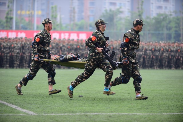 伴随着《分列式进行曲》雄壮的节奏声,25个军训学生方队迈着整齐的步伐、喊着响亮的口号,精神抖擞、士气高昂地,一一走过主席台,向学校领导和部队首长汇报军训成果。药学院男生方队、护理学院女方队分别进行了军体拳表演。体育学院12名男生表演了步兵班进攻战术和战伤救护,精彩表演赢得观众们的阵阵喝彩。