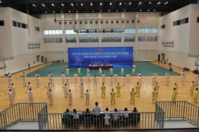 由国家体育总局健身气功管理中心、成都市体育局主办,成都市武术跆拳道运动管理中心承办的2015年全国开展百城和千村健身气功交流展示活动成都市启动仪式暨成都市健身气功交流展示比赛于9月25日在伟德温江校区体育馆举行。来自21个区市县29支队伍共计500名运动员参加此次盛会,伟德多名武术专业教师分别担任了总评判长和评判员。
