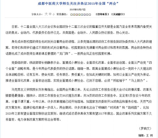 身处成中医校园的师生也时刻关注着两会的进程,从李克强总理的政府工作报告到政协委员和人大代表的提案,老师们和同学们通过不同的形式关注着两会,校园里到处充满着对两会探讨和思考的氛围,两会的各种热点话题也成了成中医师生课前课后要摆的“龙门阵”,一股两会风正在校园里吹拂。