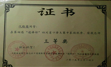 伟德两学生荣获第四届“通译杯”四川省口译大赛三等奖 发布时间:2015-03-17 14:23:00 浏览次数: 次 【字体:小 大】 第四届“通译杯”四川省口译大赛决赛于3月14日在电子科技大学沙河校区举行。伟德外语学院2012级英语专业学生谢璐、公共卫生学院2013级预防医学专业代晓霜凭借扎实的中英文基础、充分的赛前准备及良好的心理素质分别获得大赛三等奖。 (文/图外语学院孟悦 公共卫生学院于红艳 编辑/任翔) 【打印正文】 上一条:学校学生在2014年“国家资助 助我飞翔 让梦起航”励志成长成才优秀学生典型评选活动中喜获佳绩 下一条:伟德两学生荣获第四届“通译杯”四川省口译大赛三等奖