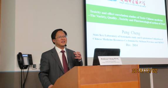 在香港大学访问期间,与香港大学中医药学院领导及专家进行了会谈。香港大学中医药学院方介绍学院历史与现状,对其人才培养的教育特色、教学模式、管理架构、承担人才培养任务以及科研等方面进行了介绍。彭成对“2011”西南道地药材协同创新中心的基本情况、组成单位、科学研究、人才培养、平台建设等进行了介绍,并邀请香港大学加入“2011”西南道地药材协同创新中心。双方就科研、人才培养等方面进行探讨,敲定合作方式:共同申请课题,以课题为载体联合培养研究生;双方专家互访,到对方学校授课,青年骨干进行访问学者交流,研究生互换培养;港大本科生到成都进行中药资源与鉴定实习实践等。彭成为港大师生以“有毒中药的毒-效关系研究”为题作了学术报告,分析附子的品种,品质,毒性和药效评价,并开展附子的临床应用、有效性、安全性以及控毒方法、机理等方面的讨论,反映热烈,受到高度评价。