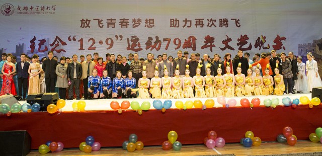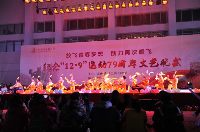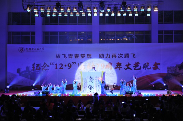 12月9日晚,由学校党委宣传部、学工部、校团委主办,校学生会承办的“放飞青春梦想,助力再次腾飞”纪念“12·9”运动79周年文艺晚会在温江校区体育馆拉开帷幕,校领导马跃荣、沈涛、余曙光、延建明、徐廉及各职能部门、学院领导、老师共计2000多名师生观看演出。