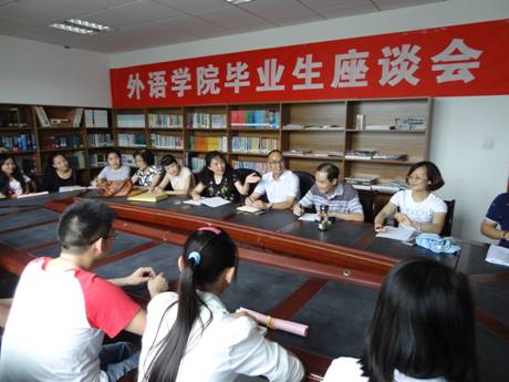 6月20日,外语学院举行2014届毕业生座谈会,党总支书记高旭亮、副院长唐小云、叶立霜、英语专业教研室主任李莉、汉语国际教育教研室主任李庆及毕业班辅导员老师,与毕业生代表进行了座谈。