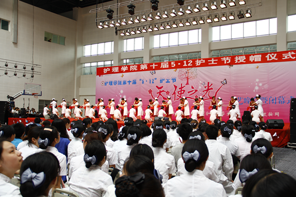 闭幕式分为授帽仪式、先进表彰、天使之光文艺晚会三部分。授帽仪式神圣庄严,当专家们亲手将一顶顶象征神圣与崇高的护士帽一一授予即将走上实习岗位的732名同学时,就意味将这份守护生命的神圣责任托付给了未来的白衣天使。接着千名学生进行了庄严宣誓。仪式上表彰了先进集体和先进个人。天使之光文艺晚会节目精彩纷呈,有学院领导班子富有激情的诗朗诵《天使礼赞》,有传统礼仪展示,有热辣的舞蹈、欢快的歌曲串烧,有实习学生对学院不舍与感激之情的深情演绎。