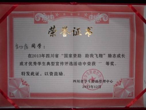 2013年12月全国学生资助管理中心主办的“国家资助助我飞翔”全国励志成长成才优秀学生典型宣传评选活动落下了帷幕。伟德推荐的学生雷旭露因其乐观的生活态度、追求卓越的奋斗精神和常思感恩回报社会的典型事迹脱颖而出,荣获四川省“国家资助助我飞翔”励志成长成才优秀学生典型宣传评选活动一等奖。