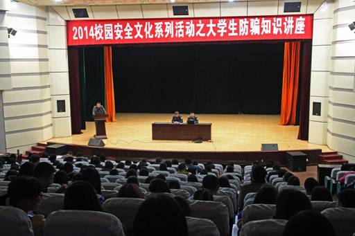 为进一步增强大学生防骗安全意识,提高防范技能,培养自我防护能力,避免违法行为的侵害,3月20日晚,保卫处邀请成都市温江区公安分局网络安全保卫大队宋扬警官、周菲警官,在百会堂演讲厅举办2014年校园安全文化系列活动之“大学生防骗知识讲座”,保卫处工作人员、各学院的辅导员和学生代表共计380人参加。会上,保卫处副处长刘先毅要求各位学生代表在今后的学习生活中要当好校园安全的宣传员、讲解员,遏制和杜绝校内诈骗案件的发生,营造良好的校园治安环境。