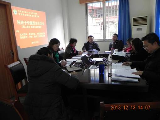 本次专题民主生活会主题为:反对四风,服务群众,为民务实清廉,促进教学、科研、临床工作全面发展。会议分两个时段:12日上午,分党委召开第一时段“专题学习会”,院领导班子集中学习了“习近平同志指导河北省委常委专题民主生活会的讲话”、“张高丽同志在四川省委常委专题民主生活会上的讲话”、“王东明同志在四川省委常委会议上的讲话”、《中国共产党章程》、“习近平同志在十八届中央纪律检查委员会第二次全会上的讲话”,集体观看了纪录片《苏联亡党亡国20年祭》。