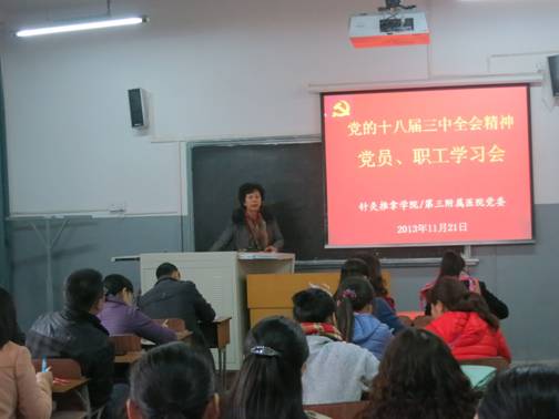 根据学校“关于认真学习宣传贯彻党的十八届三中全会精神的通知”精神,日前,针灸推拿学院/第三附属医院党委召开全院职工大会,集中学习贯彻党的十八届三中全会精神,院党委书记张虹作专题辅导报告, 副院长张俭主持学习会。