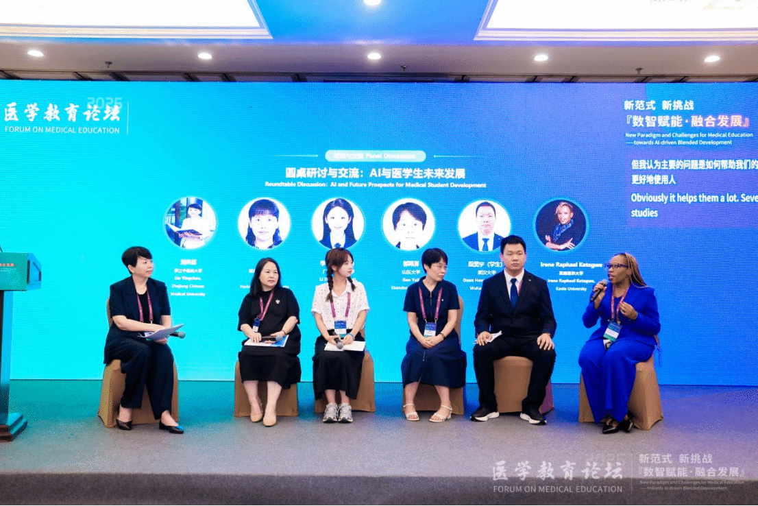 圆桌研讨环节,各位研讨嘉宾围绕分论坛主题,从专业教师和学生的视角,共同探讨人工智能技术对于医学教育带来的机遇与挑战,并提出具体应用的新见解,共探数智时代医学教育新范式。