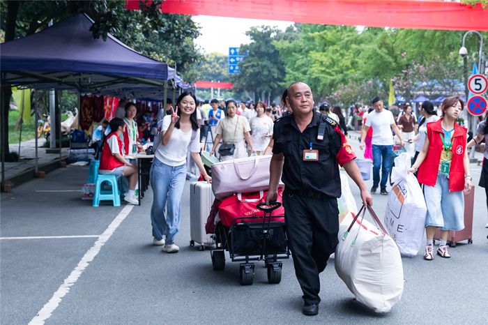 为精准回应新生及家长在入学阶段的各类实际诉求,学校各职能部门打破部门壁垒、加强协同配合,将迎新服务做细做实。在“行”的环节,学校提前绘制校园导航地图,在地铁口、校园内投放摆渡车,确保新生从抵达城市到进入校园的“最后一公里”畅通无忧;在“办”的环节,强化数字赋能,简化迎新工作流程,将迎新工作关口前移,实现信息提前发布、在线缴费选寝,新生到校后可“一码报到”,极大提高了迎新效率。在“答”的环节,学校在报到点集中设置绿色通道、奖勤助贷、应征入伍、“一站式”学生社区服务站、易班学生工作站等多个咨询服务点,全方位覆盖新生在学业衔接、生活适应、未来发展等方面的需求,高效解决报到过程中的各类疑问。与此同时,近千名学生志愿者下沉至各迎新服务点、学生公寓,全程协助新生完成入住登记、行李搬运等事宜,他们穿梭其间,以热情的引导、细致的解答,为新生构筑起一道温暖贴心的迎新保障线。