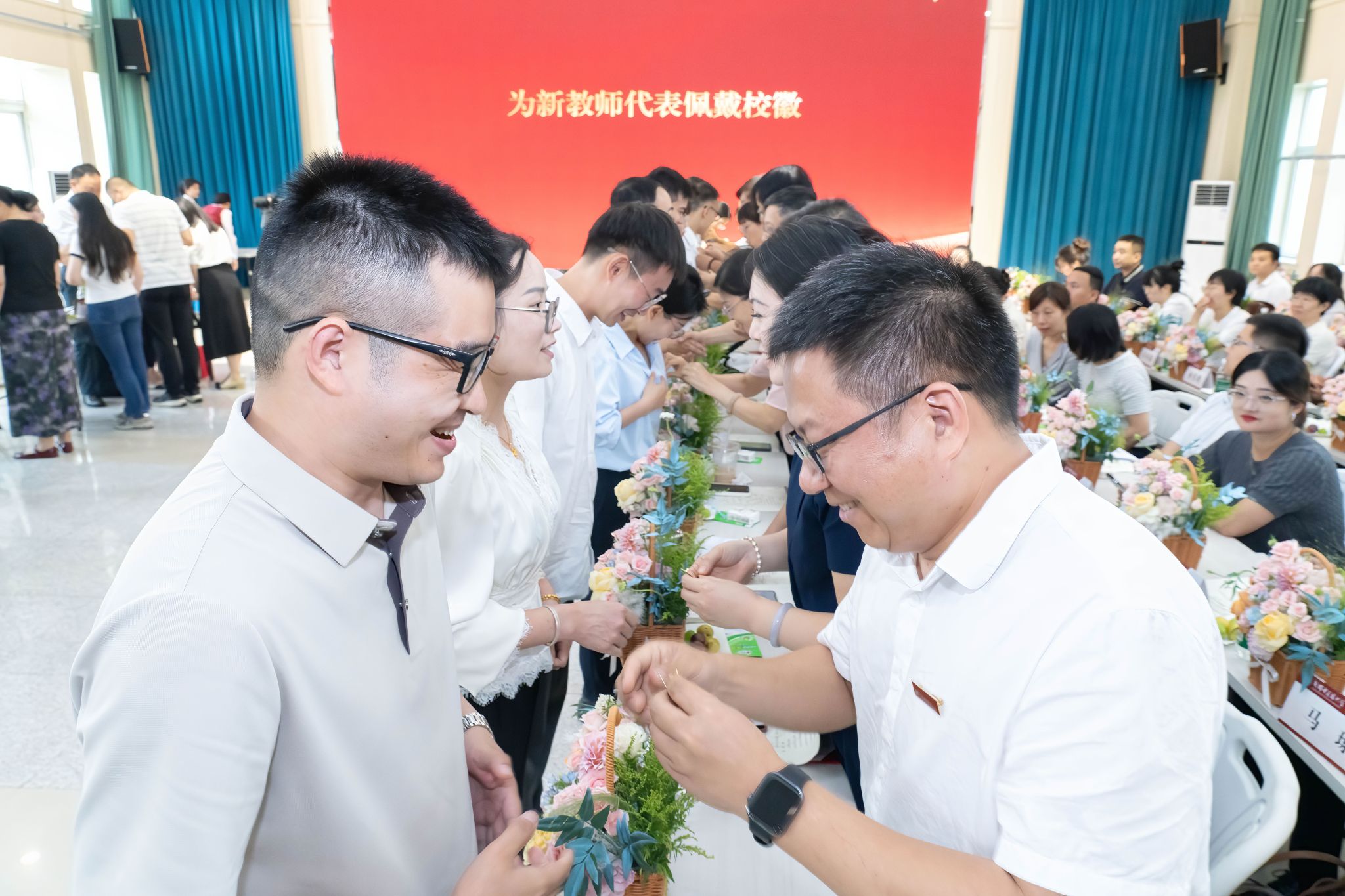 学校领导、老教师代表为新教师代表佩戴校徽。