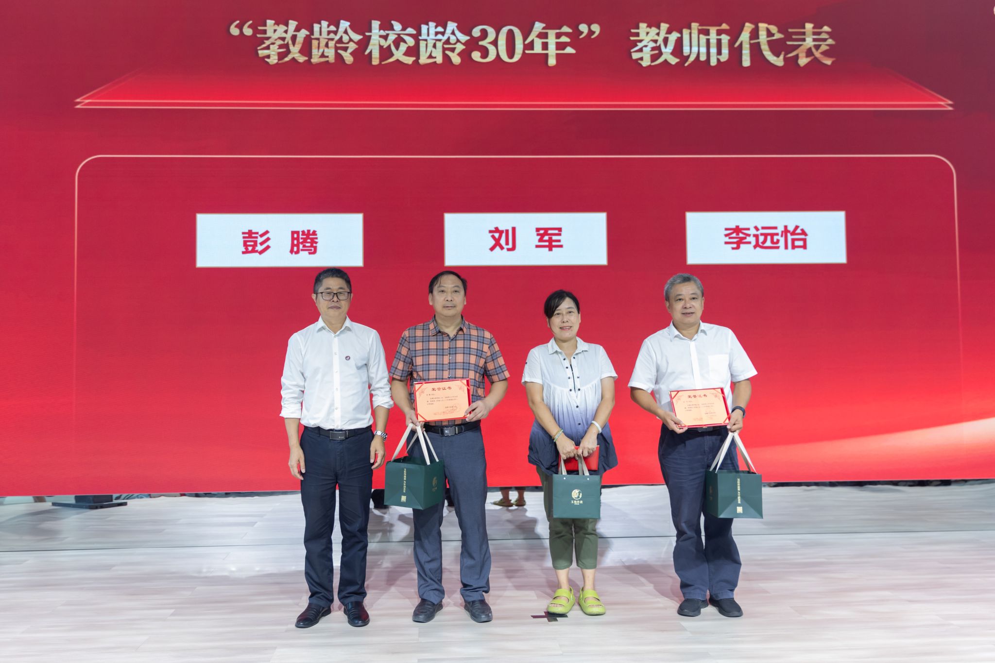 张泽钧为“教龄校龄30年”教职工代表颁奖