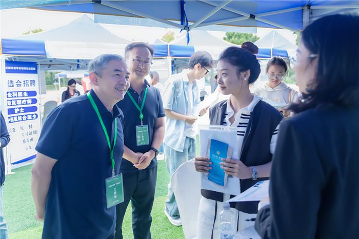学校高度重视此次招聘会筹备工作,将其作为落实“就业—招生—培养”联动机制的重要实践。学校党委书记张泽钧,党委副书记杨静,副校长冯全生等校领导深入现场指导工作,实地察看招聘展位布局与服务保障情况,充分彰显学校对毕业生就业工作的重视。在用人单位展位区,校领导一行与医院、院校、企业等用人单位的代表亲切交谈,详细询问用人单位的人才需求标准,并向用人单位介绍学校的人才培养特色,以及针对基层就业、重点群体帮扶的就业服务举措,积极推荐符合需求的优秀毕业生。在求职学子中间,校领导与毕业生面对面交流,细致了解大家的岗位意向与就业心理状态,针对简历优化、面试沟通等环节开展现场指导,鼓励学子们把握机遇,以过硬本领在守护人民健康的实践中实现职业理想,为区域医药卫生事业高质量发展注入青春力量。