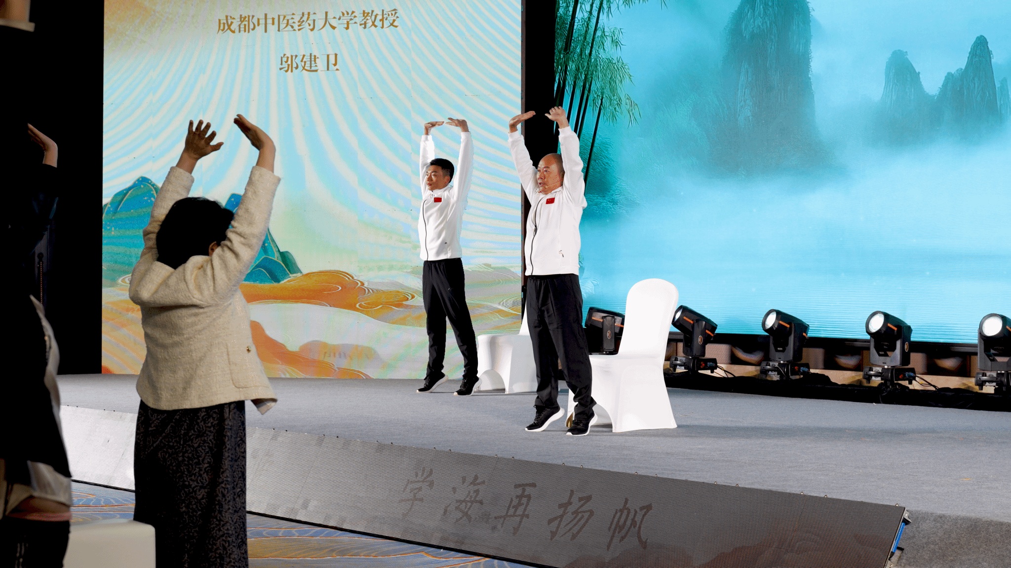 发布会现场,随着悠扬舒缓的音乐响起,邬建卫教授团队登台展示了依据《诸病源候论》等古籍文献自主创编的《案前八段锦》和《导引八段锦》。他们动作刚柔相济、行云流水,不仅完美展现了功法本身“意动形随、神形兼备”的韵味,更将其中蕴含的中医脏腑、经络调理理论通过肢体语言进行了解读。在团队的带领下,全场观众纷纷起身,认真跟练,亲身体验了中医导引术的独特魅力,现场互动紧密,气氛热烈,掌声不断。