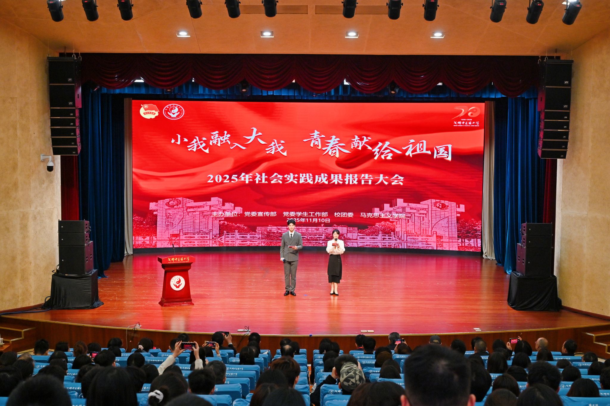 为全面落实立德树人根本任务,深入推进“三全育人”综合改革,将思政小课堂同社会大课堂紧密结合,11月10日下午,由伟德党委宣传部、学生处、校团委、马克思主义学院联合主办的“小我融入大我,青春献给祖国”2025年社会实践成果报告会在温江校区百会堂演播厅成功举办。学校党委副书记杨静,党委常委、宣传部部长张希和来伟德参加学习贯彻党的二十届四中全会精神暨第三届全国中医药院校“大思政课”建设研讨会的专家代表,安徽中医药大学党委常委、宣传部部长、马克思主义学院党委书记董玉节,广州中医药大学马克思主义学院党委书记龚建文,上海中医药大学马克思主义学院党总支书记王鑫,湖南中医药大学马克思主义学院党委书记李晖,天津中医药大学马克思主义学院院长李大凯,福建中医药大学马克思主义学院党总支书记林铭,以及伟德学生处、校团委、马克思主义学院负责人,各学院学生工作分管领导,各实践小队代表、指导老师及全体辅导员齐聚一堂,共同观看了这场青春实践答卷。