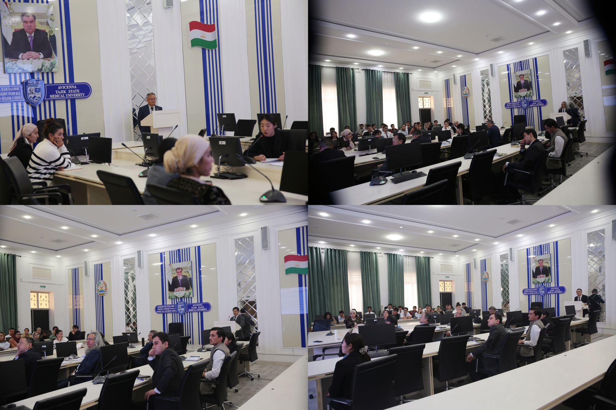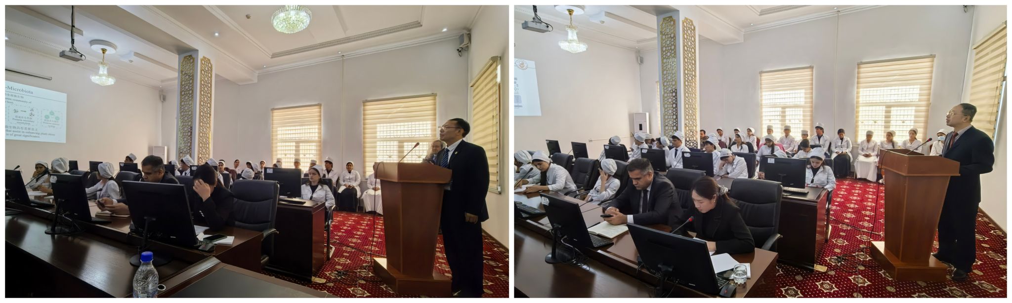 在阿维森纳塔吉克国立医科大学学术报告厅,严铸云教授和黄勤挽教授对药学专业师生作《微生物合成群落提升丹参药材品质研究》《胆黄连介导肠道菌群和短链脂肪酸代谢治疗2型糖尿病机制研究》的学术报告,启动本年度“岐黄中医课堂”线下教学活动。报告会由阿维森纳塔吉克国立医科大学药学院院长古尔马哈姆佐达·扎法尔教授主持。